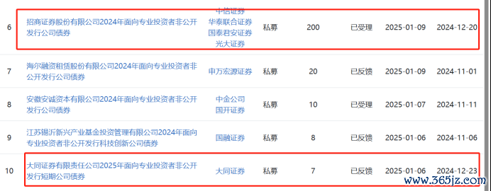 仅从上交所情况来看,就至少包括招商证券(公司债,拟发行不超过200亿元)、大同证券(短期公司债,不超过7亿元)、光大证券(公司债,不超过100亿元)、国泰君安证券(公司债,拟发行不超过200亿元)等4家券商面向专业投资者非公开发行债券获得交易所反馈或受理,其中除了招商证券是2024年私募债,其他3家都是2025年私募债,发布时间集中在2025年1月初。私募债发行额度普遍在100亿-200亿元。
