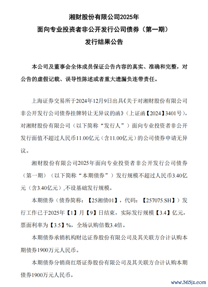 湘财股份2025年面向专业投资者非公开发行公司债券(第一期)发行结果公告