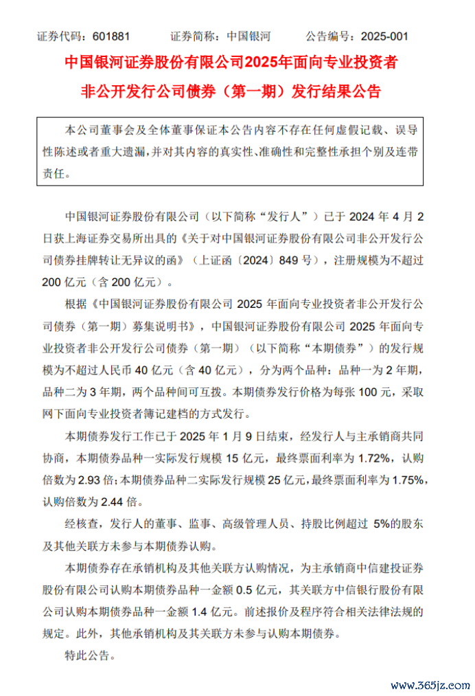 不仅如此,银河证券1月9日发布公告,公司2025年面向专业投资者非公开发行公司债券(第一期)债券发行工作已于1月9日结束。本期债券品种一实际发行规模15亿元,最终票面利率为1.72%,认购倍数为2.93倍;本期债券品种二实际发行规模25亿元,最终票面利率为1.75%,认购倍数为2.44倍。