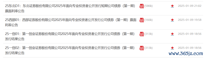 再看深交所,主要是公募债居多。包括东北证券(拟发行不超过20亿元)、西部证券(拟发行不超过10亿元)、第一创业证券(拟发行不超过15亿元,最终发行8亿元)均有2025年公司债的利率公布或者发行结果在1月9日披露。