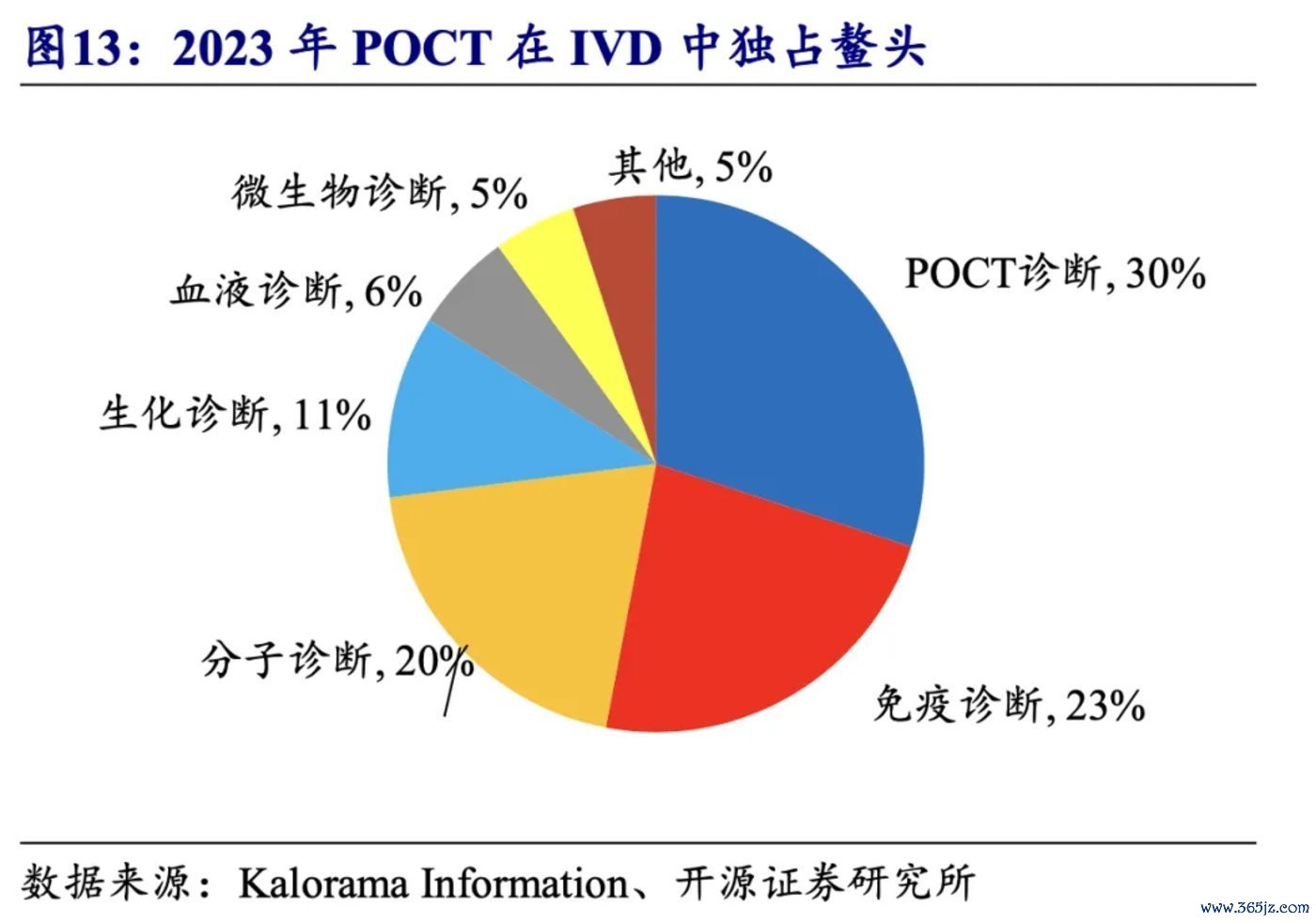 不过,就单POCT领域,万孚还大有可为。按照检验原理/方法分类,IVD市场可细分到POCT诊断、免疫诊断、分子诊断、生化诊断、血液诊断和微生物诊断等领域,截至2023年,POCT是整个IVD市场最大的细分领域,占据了30%的份额。